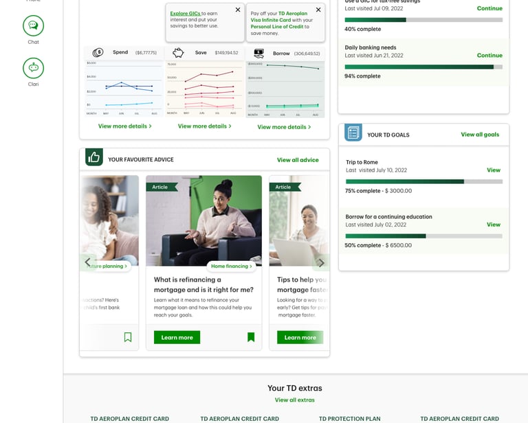 Customers struggle to grasp the value and benefits of their TD financial products. The objective was to design a centralized dashboard that provides clear, personalized financial advice, guides day-to-day financial decisions, and supports users in achieving their financial goals.